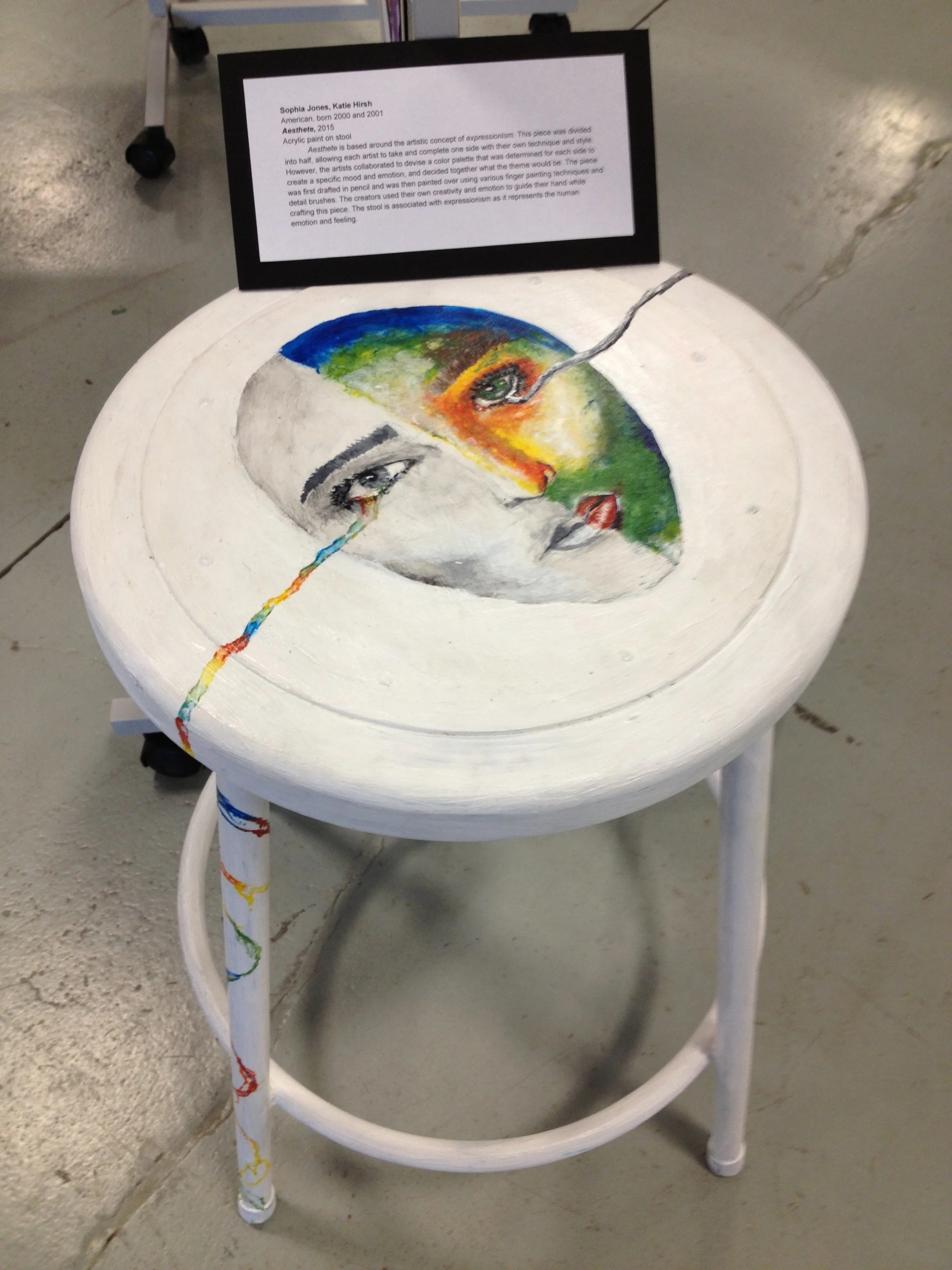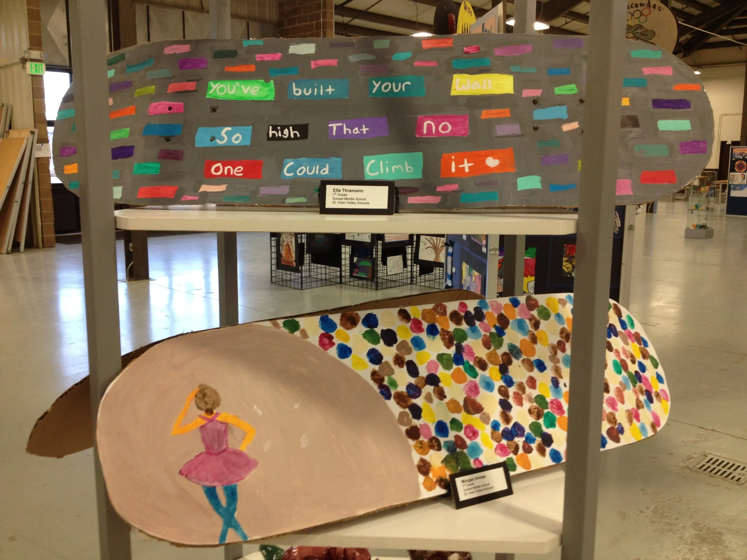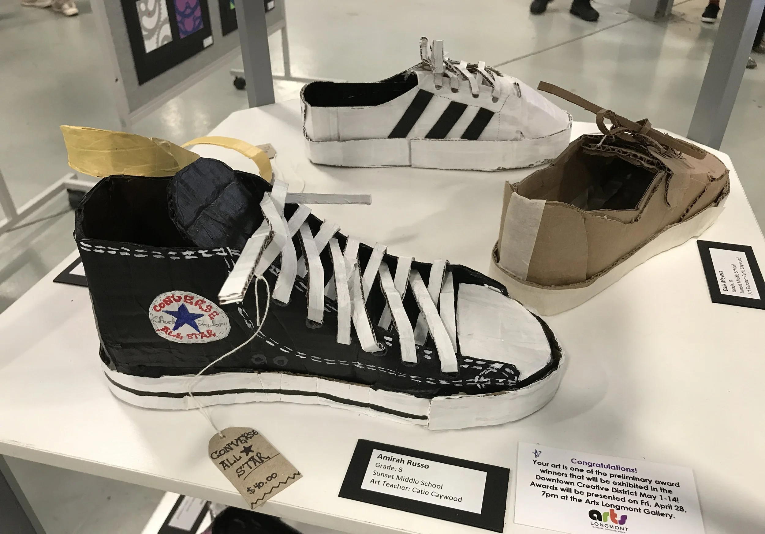 Over one hundred Sunset Middle School student artists in grades sixth, seventh, and eighth are represented each year at the St. Vrain Valley School District Art Show held at the Boulder County Fairgrounds. Many students are recognized with art awards from district teachers, administrators, and the community. This year, five students were selected by Arts Longmont to have their work displayed in downtown businesses for two weeks in May, and will be featured during the 2nd Friday Art Walk.